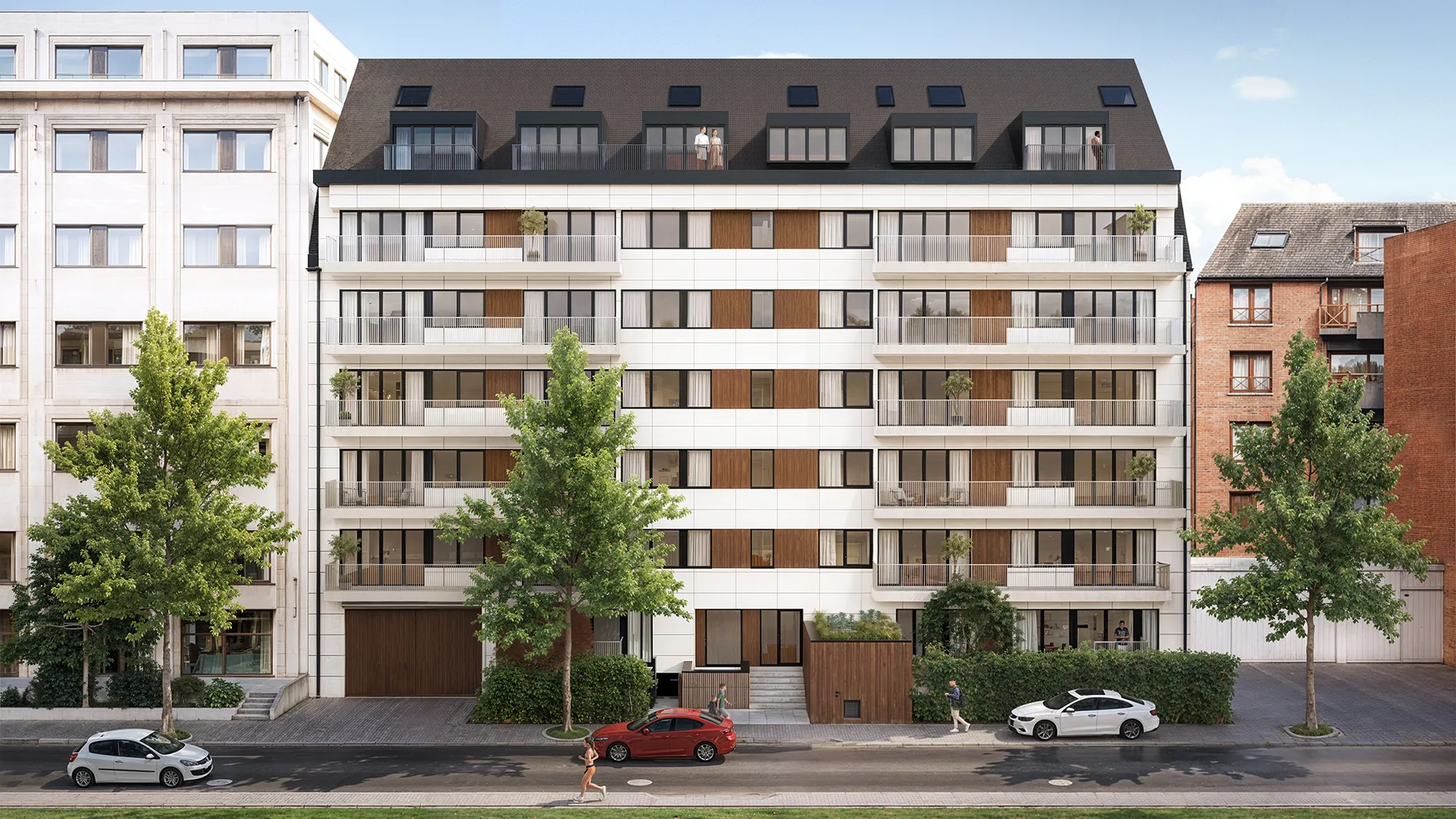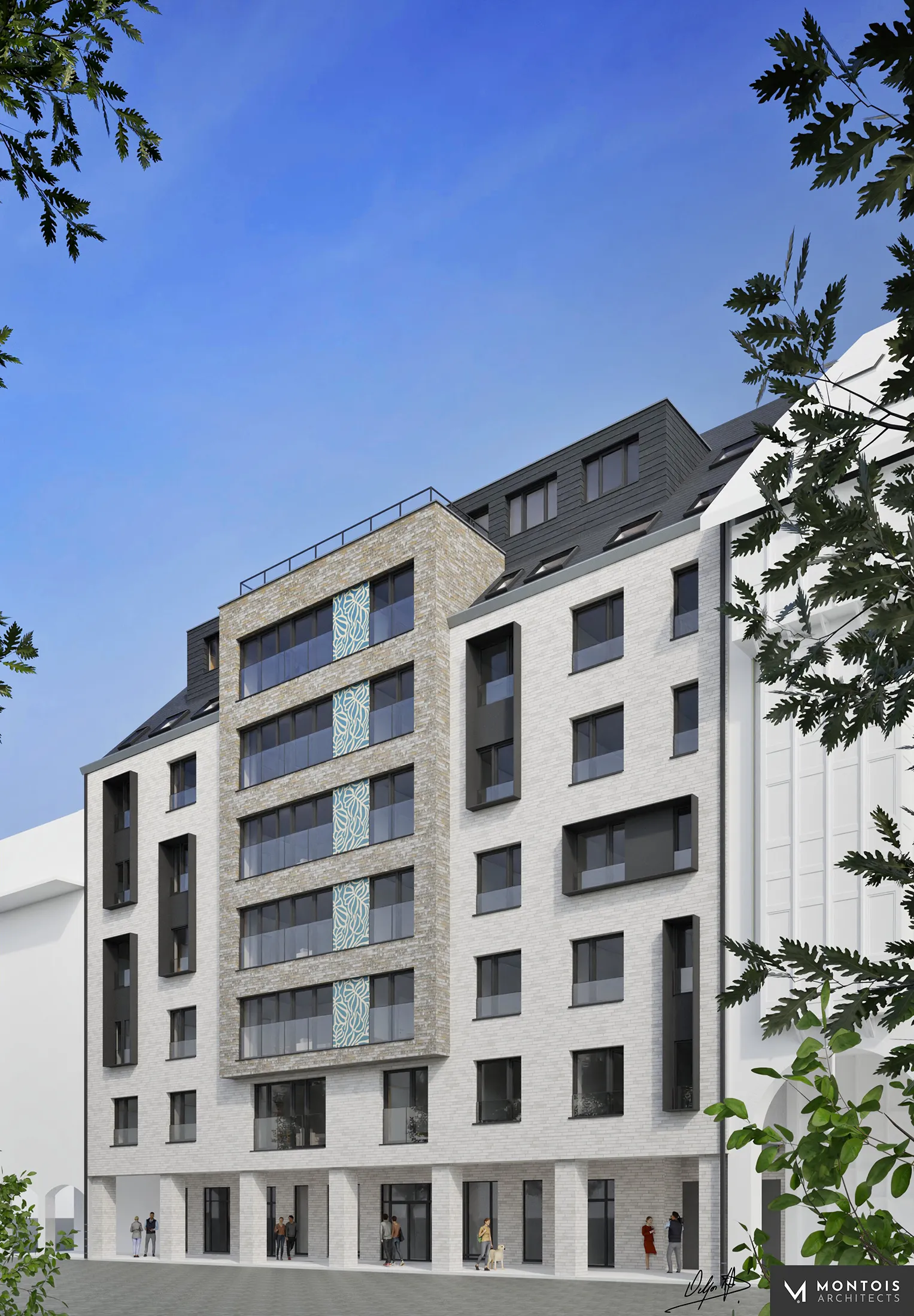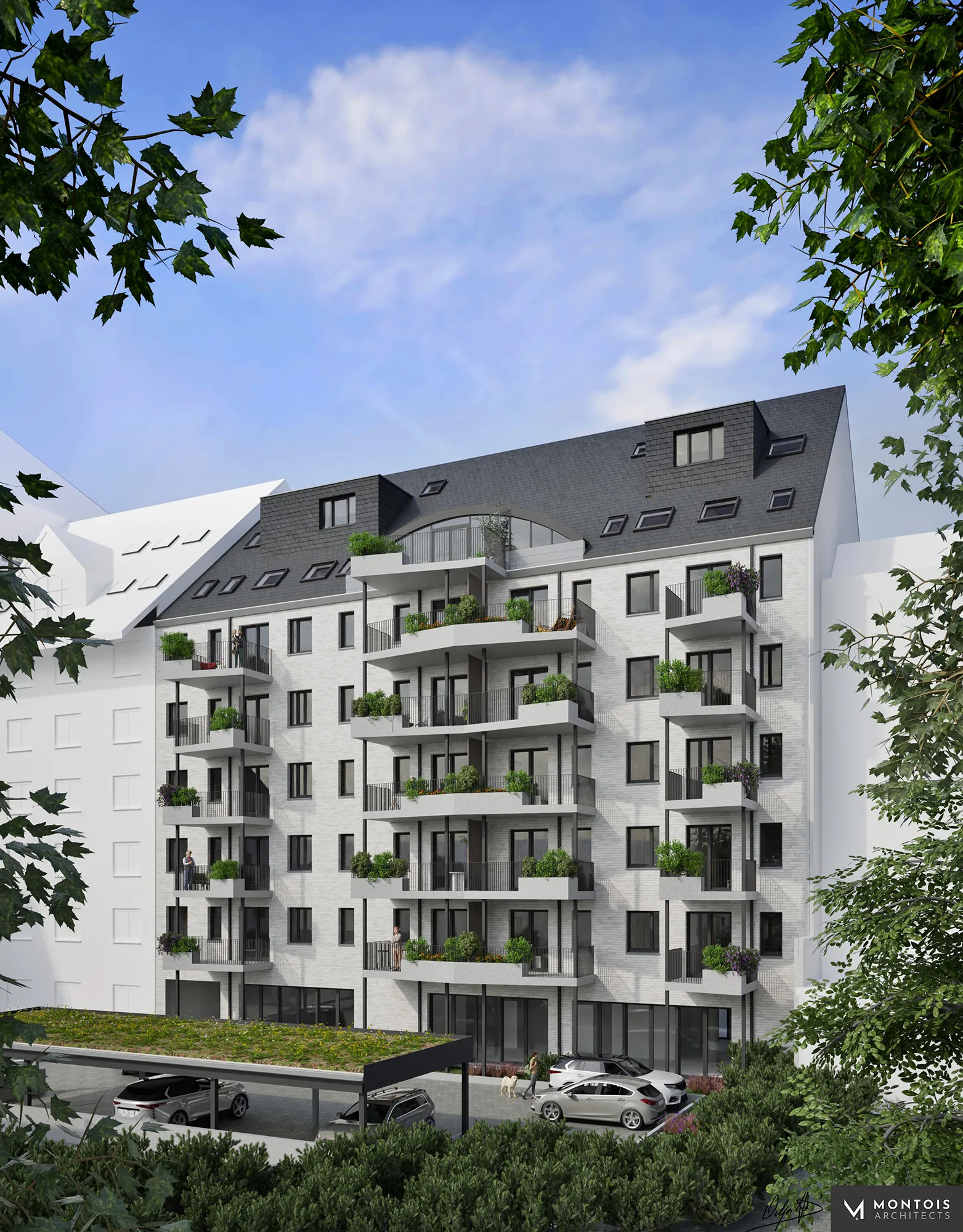 Certains appartements situés à l’arrière, aux premiers étages, disposeront de balcons, tandis que les appartements d’angle seront dotés de balcons dits « à la française » — une barrière de sécurité installée devant une porte-fenêtre, sans plateforme saillante.